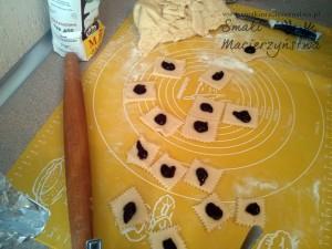 3. Na każdy kwadrat nakładamy marmoladę, łapiemy za dwa przeciwległe końce ciasta i mocno zaciskamy.
