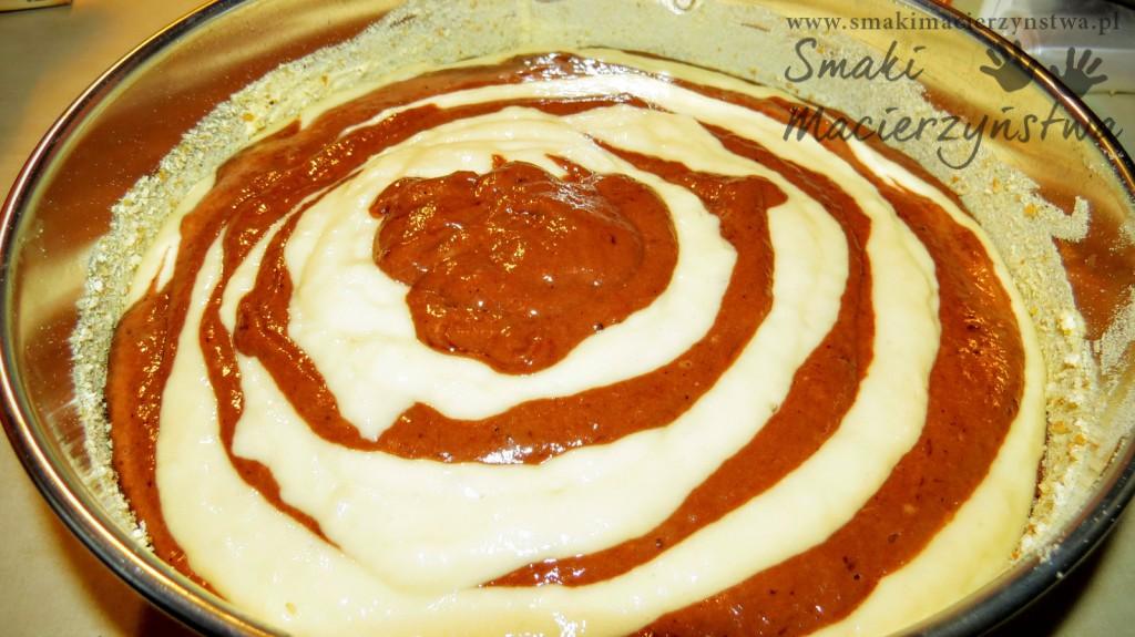 6. Na środek tortownicy nakładać na przemian po dwie, trzy łyżki białego i ciemnego ciasta. Będą się one stopniowo rozlewać po całej formie.