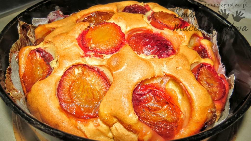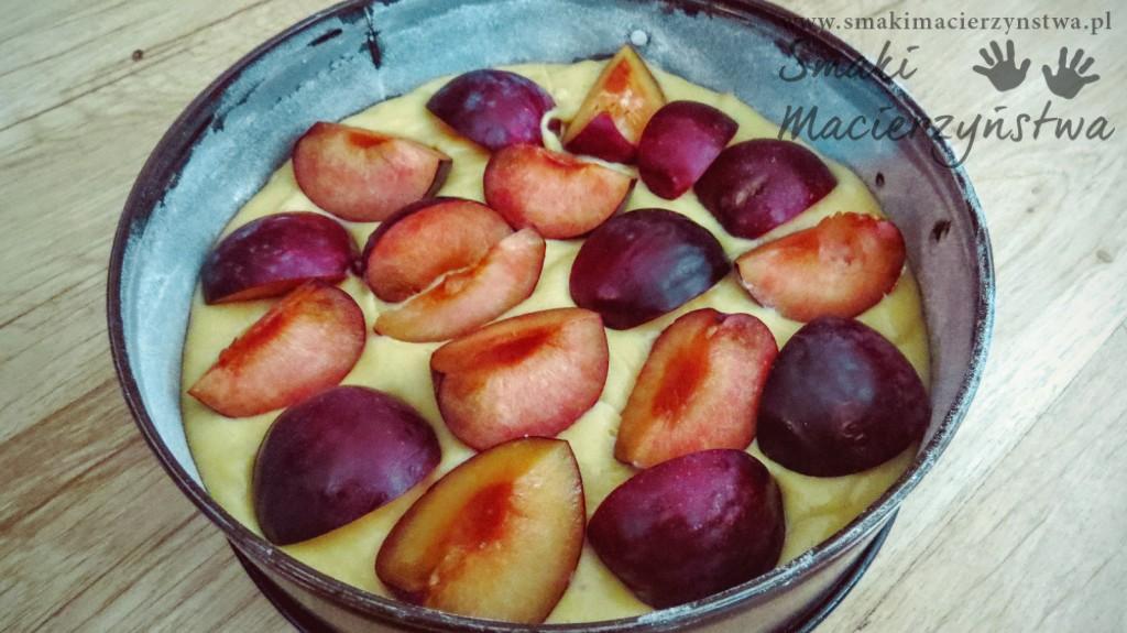 - Na blachę wyłożoną papierem do pieczenia wylewamy ciasto, na którym z góry układamy połówki śliwek.