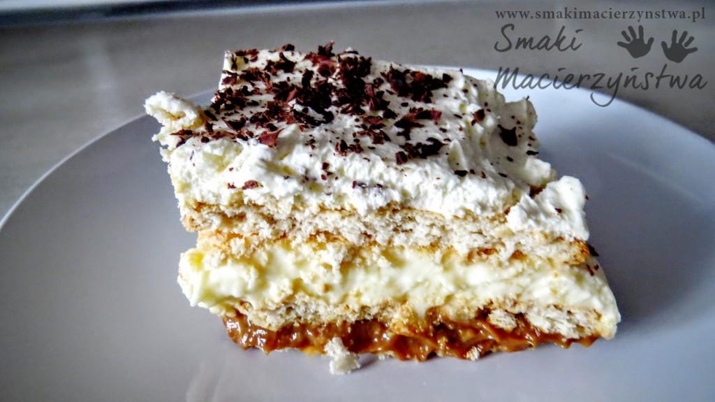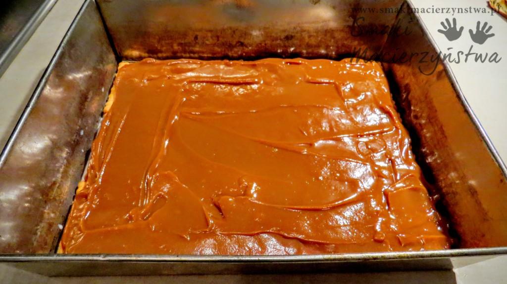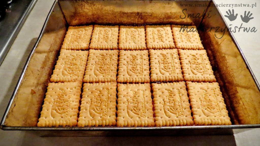 - W garnuszku podgrzać masę kajmakową i równomiernie rozlać ją na herbatnikach.