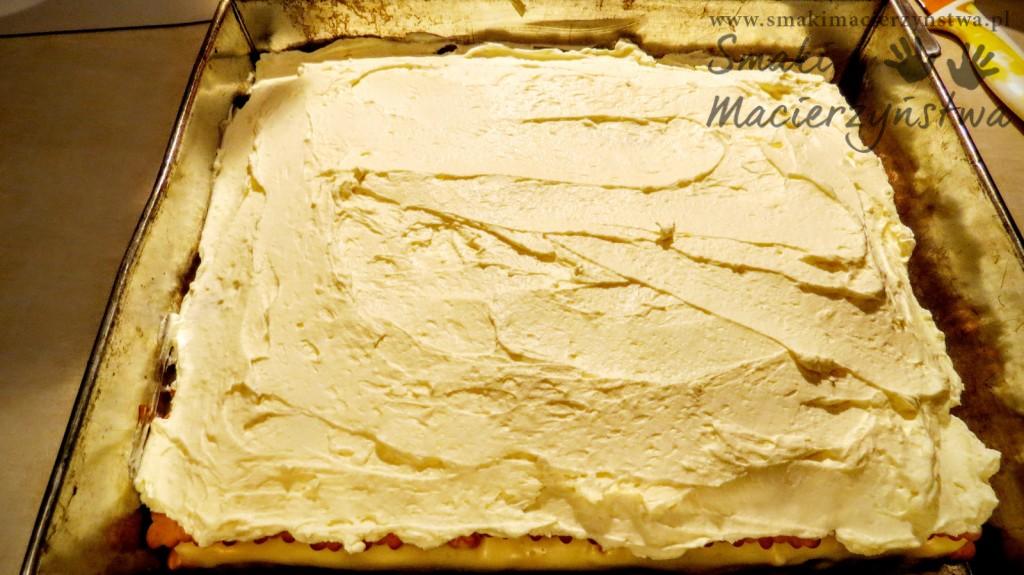 - Na masę kajmakową ułożyć kolejną warstwę herbatników. Na herbatniki wykładamy masę budyniową i rozsmarować po całości.