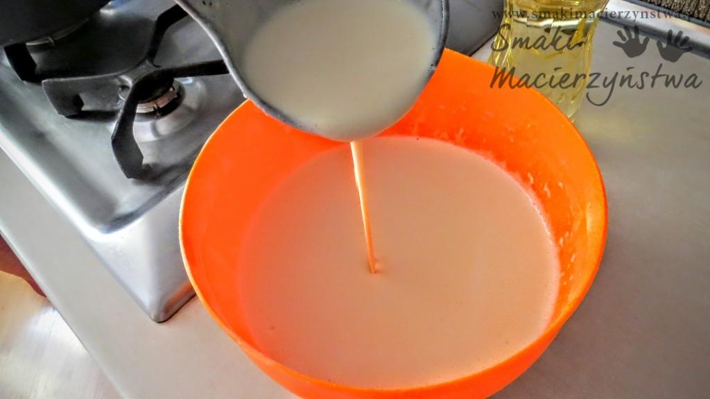 - Ubić jajka z solą. Następnie po kolei dodawać pozostałe składniki i miksować, aż do momentu uzyskania jednolitej masy (patrz zdjęcie). Ważne jest to, że masa nie może być ani za rzadka, ani za gęsta tylko powinna się dać łatwo rozlewać na patelni.