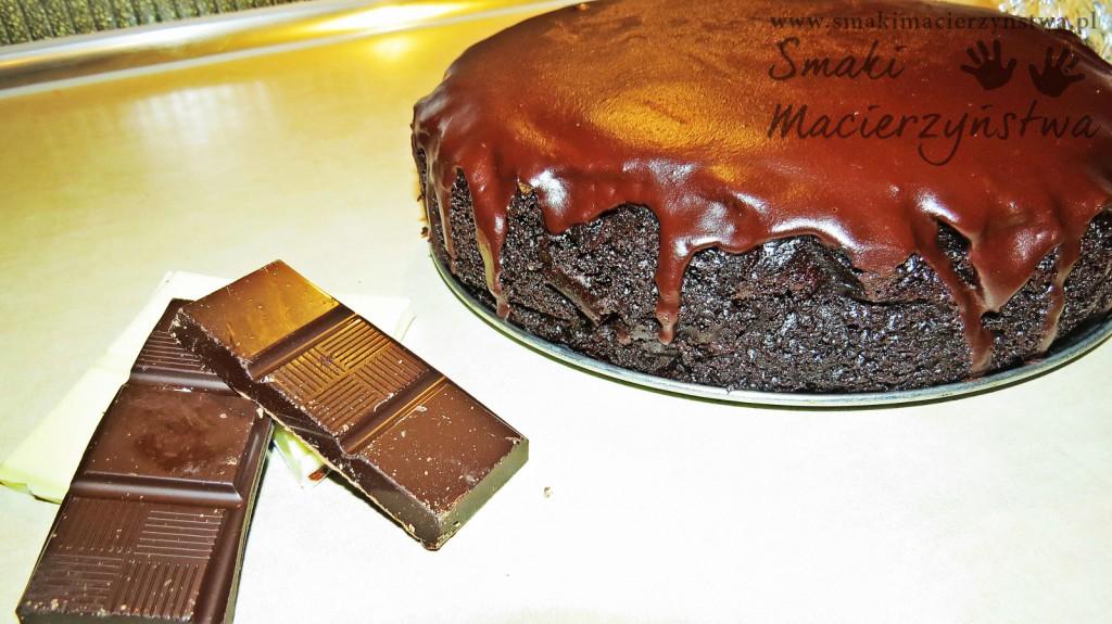- Polewę przygotować z pozostałej nam tabliczki czekolady i mleka. W tym celu rozpuścić 3/4 tabliczki czekolady w garnuszku wraz z dwoma łyżkami mleka. Nie doprowadzić do gotowania, jedynie rozpuścić i podgrzać wspomniane składniki. Gdy polewa będzie miała płynną konsystencję polać nią ciasto.