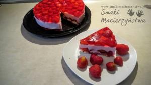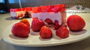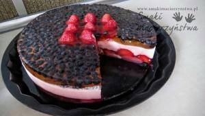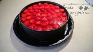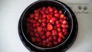 - Gotową piankę wylać na tortownicę i włożyć do lodówki, aż lekko zastygnie. Następnie ułożyć truskawki (lub inne owoce) delikatnie dociskając do pianki.
